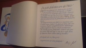 Heute dann war ich mit dem Elmshorner Bürgermeister Volker Hatje verabredet. Er bekräftigte, dass er die Idee toll fände und gratulierte Glückstadt durch einen Eintrag ins Glückwunschbuch. Was er schreibt und vor allem, was er von den Glückstädtern wissen möchte, erfahrt Ihr in Kürze.